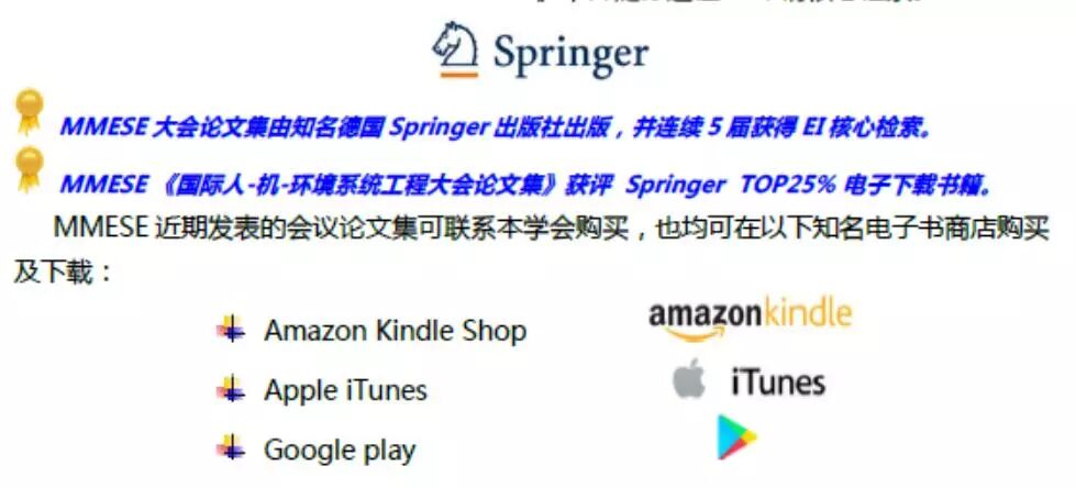 MMESE大會論文集已連續(xù)6屆獲得EI核心檢索。而且,MMESE 《國際人-機-環(huán)境系統(tǒng)工程大會論文集》也巳獲評 Springer TOP25% 電子下載書籍榮譽稱號。MMESE發(fā)表的會議論文集可聯(lián)系本學(xué)會購買,也可在電子書商店購買及下載。